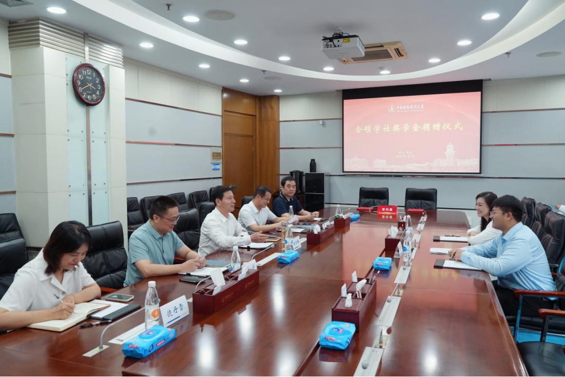 毕业之际,经济学院2025届毕业生杨浩然向母校捐赠10万元,设立“金领学社奖学金”。7月3日下午,捐赠仪式在中原楼五楼会议室举行。校长、党委副书记朱方伟,经济学院院长石智雷,教育发展基金会秘书长笪宁,以及武汉闽商青创科技有限公司董事长张晶晶等嘉宾共同出席见证。仪式由经济学院院长石智雷主持。