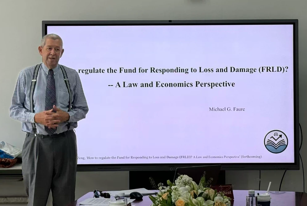 Faure教授以“How to regulate the Fund for Responding to Loss and Damage? A Law and Economics Perspective”为主题,全面探讨了应对损失和损害基金(FRLD)的规范监管问题,然后从法和经济学的交叉视角分析了自然灾害补偿机制的经验启示,最后在实践方面探讨了贡献者责任、受益者与受益程度以及基金管理的具体建议。与谈人戴胜副教授和孙林林讲师就气候变化的成本衡量、FRLD的预估和可用额度和国家与企业在气候变化方面承担的义务及义务提供了何种法律依据等问题和Faure教授展开了激烈的讨论。