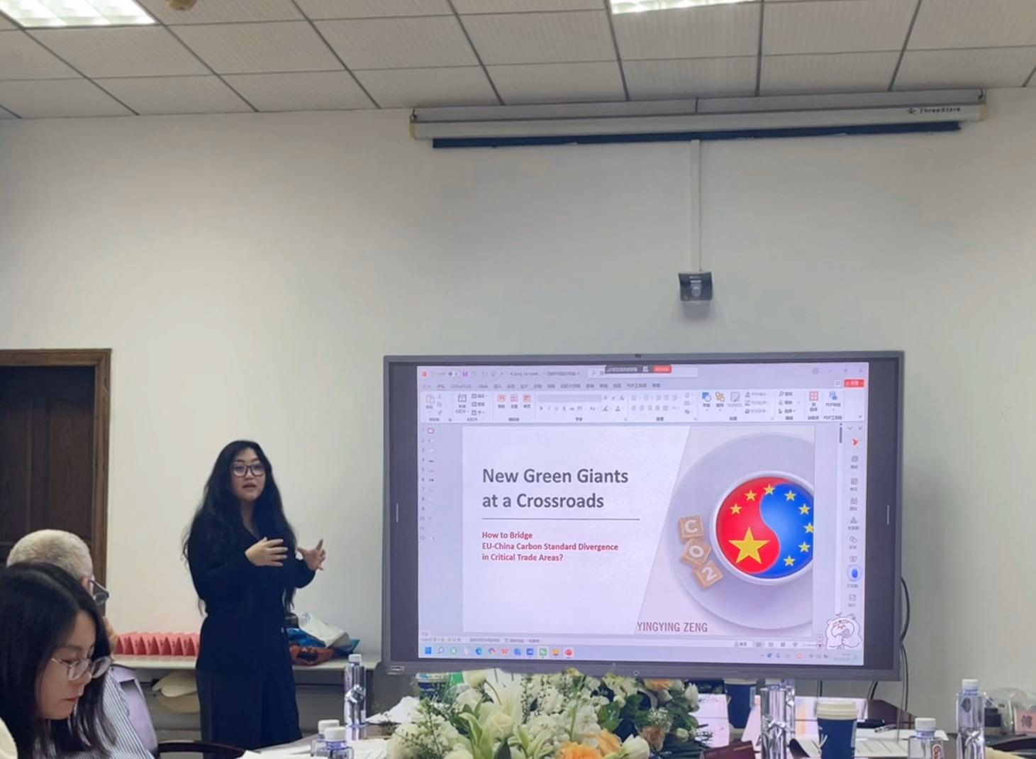 最后,曾盈盈副教授以“New Green Giants at a Crossroads——How to bridge EU-China Carbon Standard Divergence in Critical Trade Areas?”为主题,探讨了在全球气候治理背景下,欧盟与中国这两个“新绿色巨头”在关键贸易领域中低碳标准分歧的问题,提出了法律经济学的分析框架,探讨政府角色在解决市场失灵方面的作用,最后通过两个关键贸易领域的案例研究,展示了不同类型的低碳标准在实际贸易中的应用和影响。与谈人戴胜副教授和Faure教授就不同国家碳足迹要求及旧标准与新标准之间对各方产生的实际损失、各国目前的行动等方面与曾盈盈副教授展开了讨论。