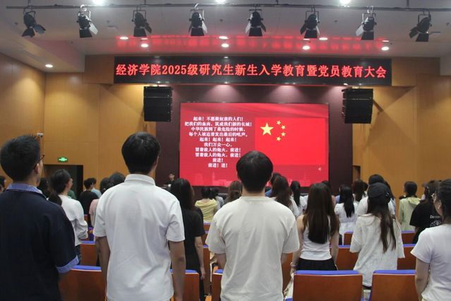 为助力经济学院2025级研究生新生顺利开启学术新程,同时强化新生党员党性修养,经济学院于9月14日14:30在文翰楼北报告厅举办研究生新生入学教育暨党员教育大会,2025级硕士研究生辅导员岳明泽、2025级博士研究生辅导员雷菁、经济学院全体2025级研究生新生参与本次大会。
