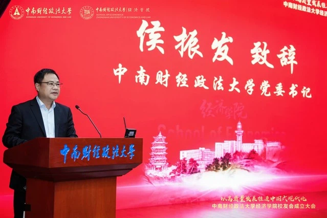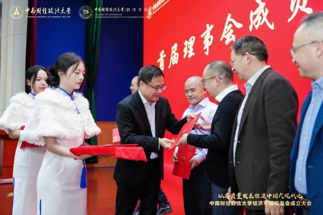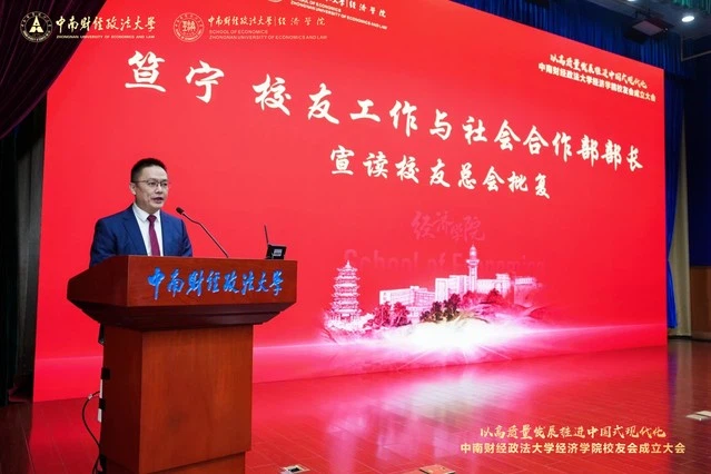(通讯员 巩震鲁 黄亚群)金秋时节,硕果满枝,暖意融融,南湖之畔处处洋溢着喜迎校友的热烈氛围。11 月 1 日上午,以高质量发展推进中国式现代化研讨会暨中南财经政法大学经济学院校友会成立大会在南湖校区文泉楼报告厅隆重召开。校党委书记侯振发,校党委常委、副校长覃红,原校党委书记徐敦楷,原副校长邹进文,党委办公室、学校办公室主任兼督察办公室主任刘建明,校友工作与社会合作部部长笪宁,原经济学系党总支书记、校纪委副书记张香珍,经济学院原党委书记胡江滨、原党委副书记蒋雪岩,经济学院教授程启智,特邀嘉宾湖南财政经济学院党委书记易棉阳出席大会,返校校友代表、学校相关职能部门负责人、学院离退休教师代表、在职教师代表及学生代表齐聚一堂,共襄盛会。