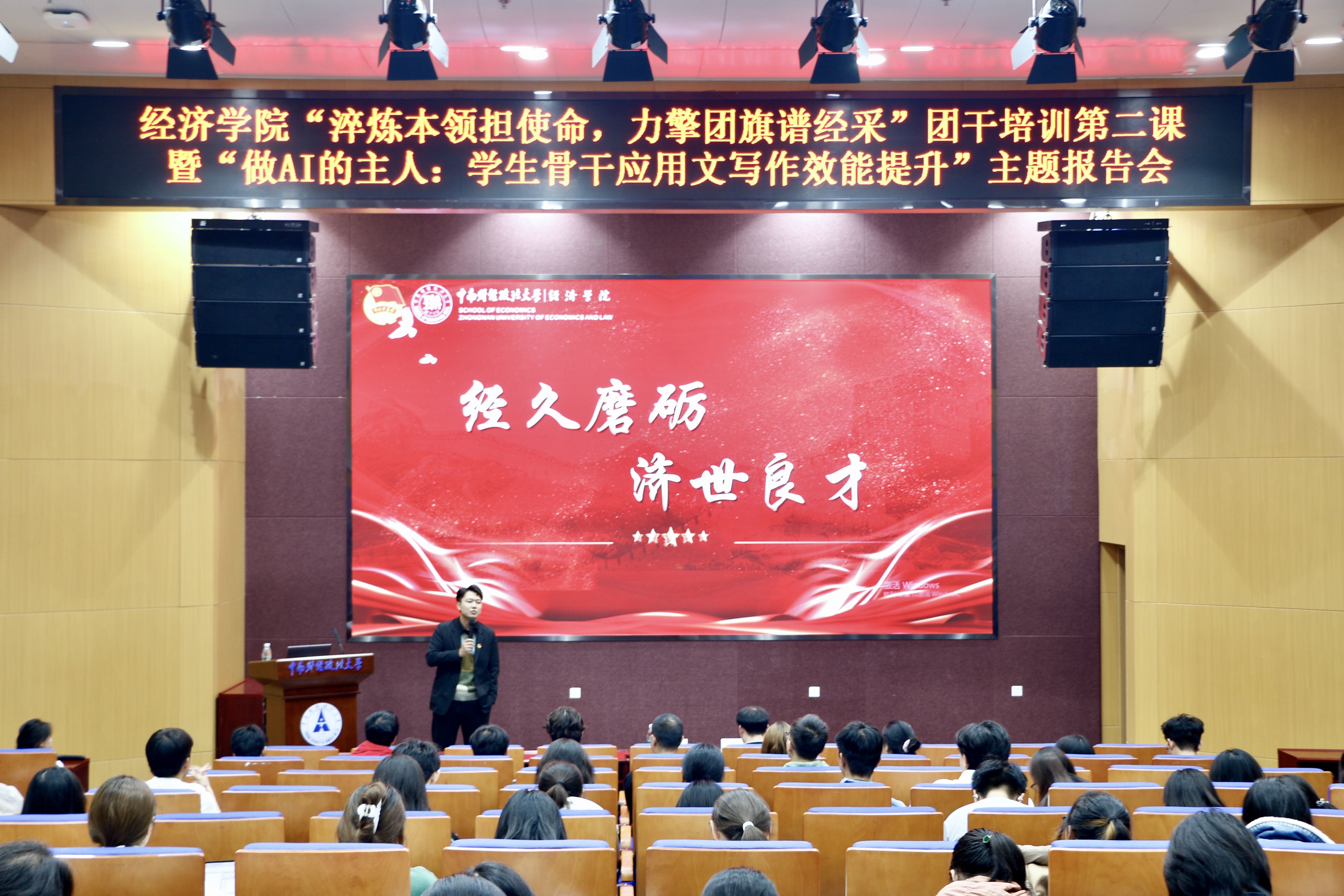(学生记者 吴迪宇昂 摄影 郭紫琳 )为了深入贯彻新时代青年工作理念,全面提升学生骨干应用文写作能力,增强基层团组织“三力”,2025年11月6日下午,中南财经政法大学经济学院2025年“做AI的主人”主题报告会暨团干培训第二课于南湖校区文瀚楼北报告厅顺利举办。华中师范大学文学院团委书记崔宏博受邀主讲,经济学院团委书记陈远瞻及学院2025级学员到场参会。